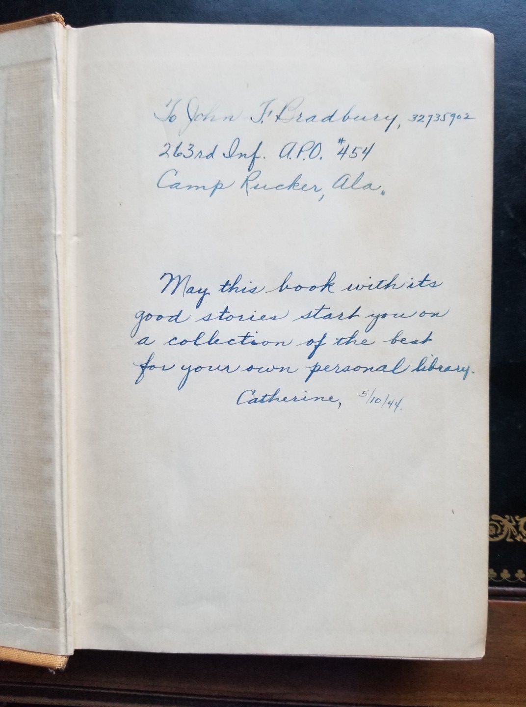 Addressed to a John J. Bradbury, a member of the 263rd infantry division stationed at Camp Rucker, Alabama, it was sent to him by a woman named Catherine who wrote, “May this book with its good stories start you on a collection of the best for your own personal library.” It is dated May 10, 1944. The world is on fire with war and no one knows how it will end. A young man is at army camp, presumably preparing to join in the fighting. A woman sends him a book containing some of the best stories and poems in English and American literature.