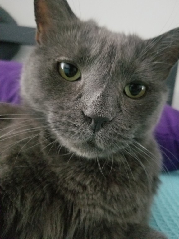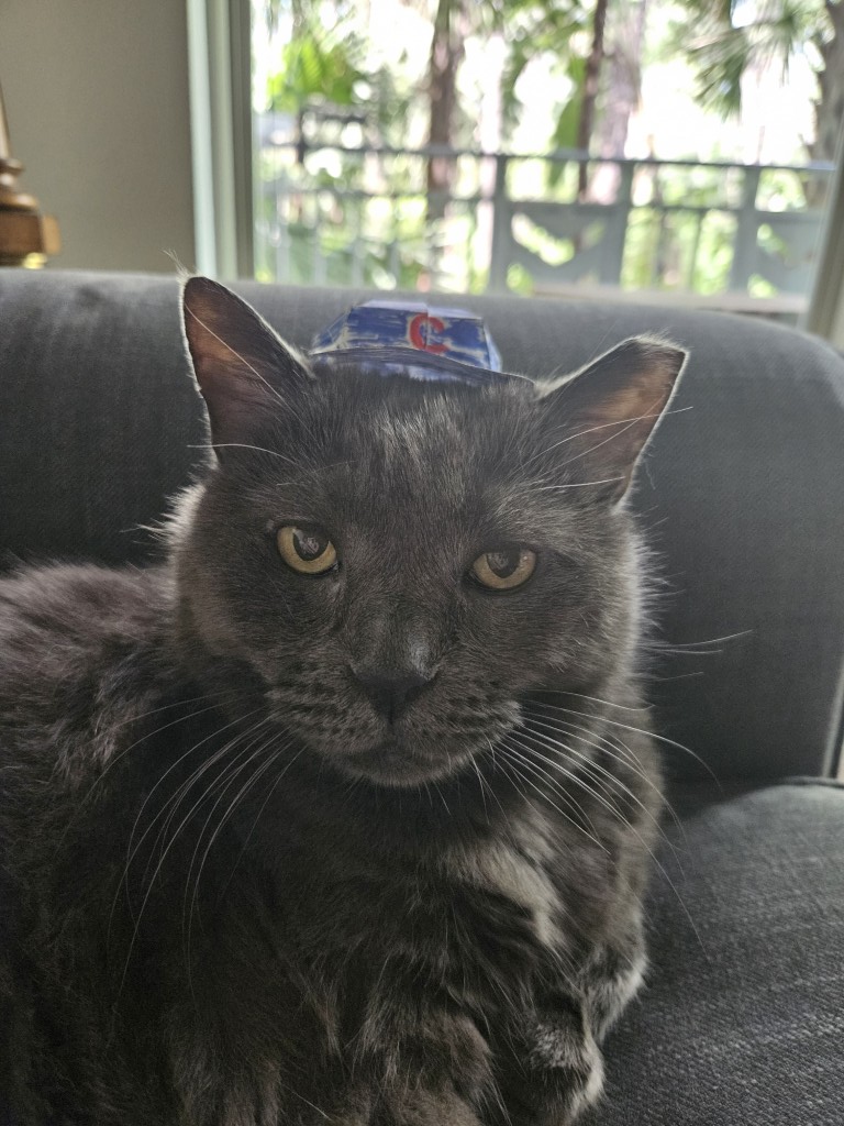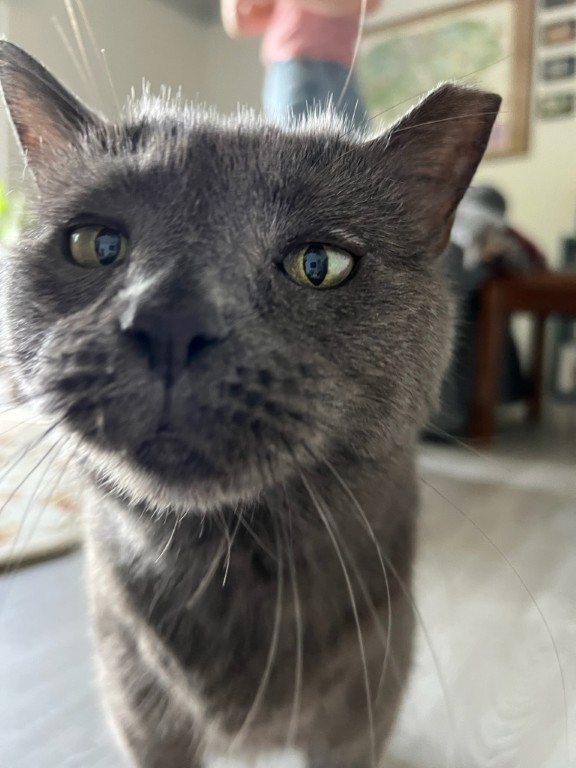 Back in 2018 I lost Ashford. He’d been my best friend and companion for 14 years. I was devastated and thought I’d never have another cat. A few months later we discussed rescuing another, as so many need homes. The thought of providing that home felt good, but still I thought I couldn’t feel that deeply again. Ashford endeared me to gray cats, and we knew we wanted an older one as they’re often passed over, and so, while scrolling the San Diego Humane Society website we found a picture of a slightly dopey gray lady with a wonky ear. Her name was Samantha and it said she was 12, described as “happy-go-lucky, carefree, engaging, adaptive, and cheerful.”